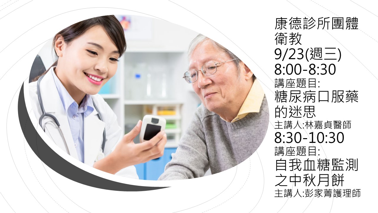 血糖藥控制好,正確知識和行動的觀念不可少。 9月份的糖尿病團體衛教由林嘉貞醫師與彭家菁護理師幫大家講解糖尿病用藥與血糖的量測。 歡迎有興趣的朋友致電診所報名參加。 9/23(週三)8:00-8:30 講座題目:糖尿病口服藥的迷思 主講人:林嘉貞醫師 9/23(週三)8:30-10:30 講座題目:自我血糖監測之中秋月餅 主講人:彭家菁護理師