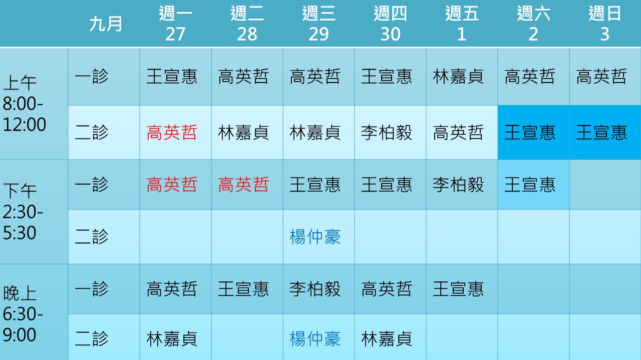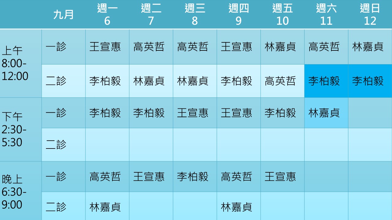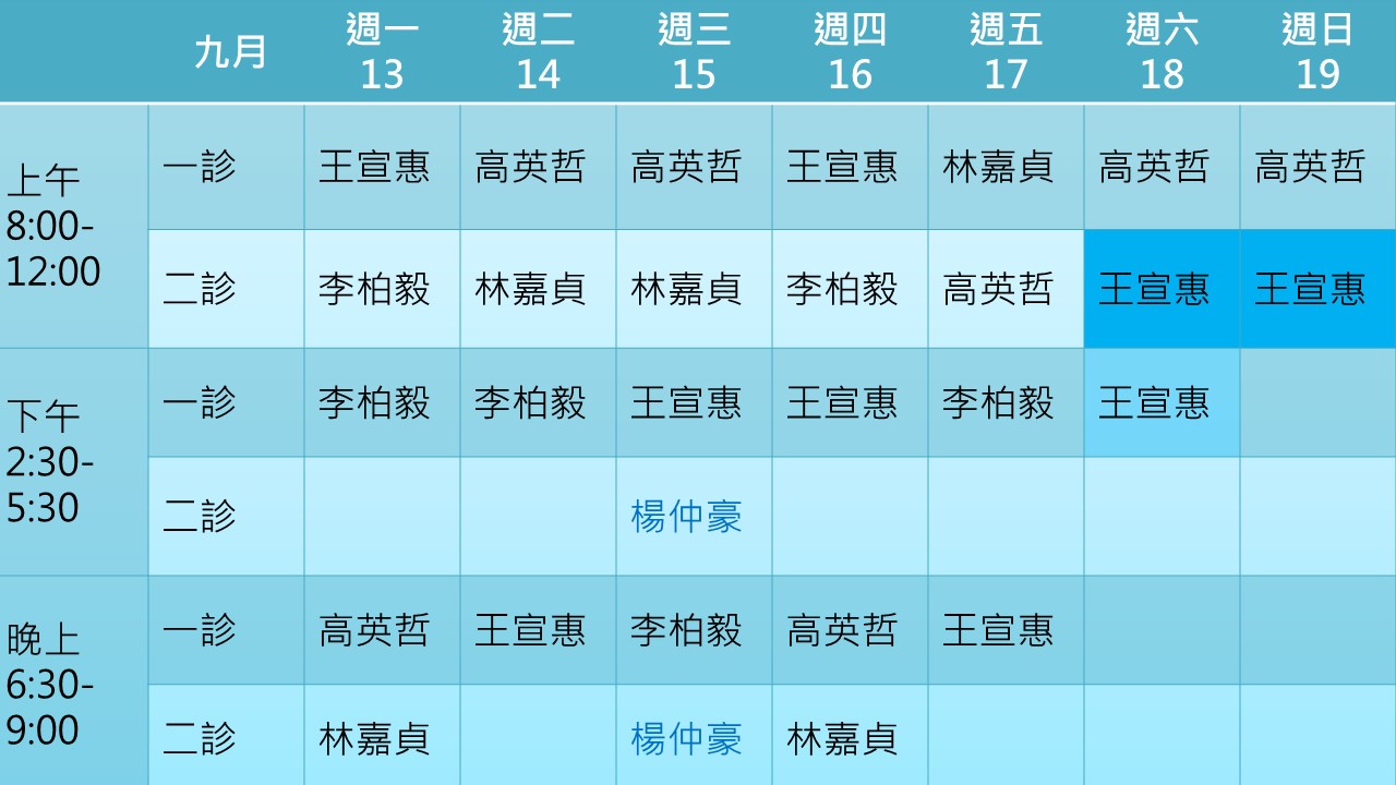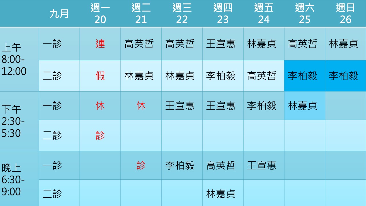 110年9月門診表如下表所示 身心科楊仲豪醫師9月1日起改為隔週三下午晚上看診,其他時段楊醫師於竹北暖陽身心診所看診。 適逢中秋連假,9月18日下午開始至9月20日暫停抽血服務,9月21日恢復抽血服務。歡迎中秋節上午來抽血檢查。 9月20日(週一)休診一天,9月21日(中秋節)早上照常看診,下午晚上休診。 9月27-28日李伯毅醫師因家中有事請假,由高英哲醫師代診。